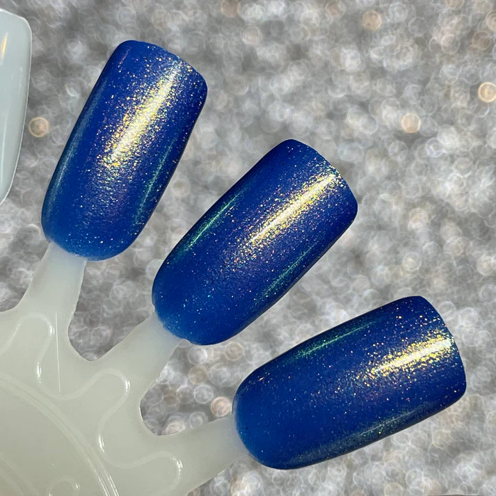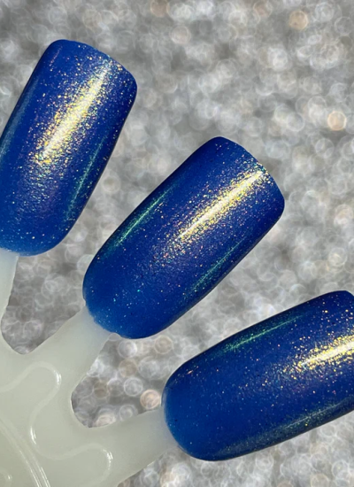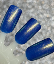 This polish has a blue base and strong gold shimmer. The combination of base and shimmer can cause the base to appear slightly green in some lighting conditions.