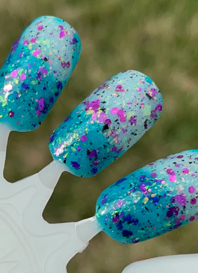 This one is a teal thermal that goes clear when warm. The base has fuchsia shards and fuchsia & pink glitters as well as shifty green flakes.