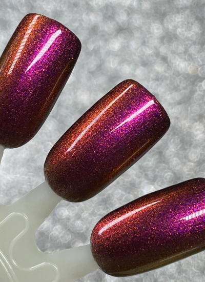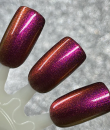 This polish has a jelly black base with purple, pink, orange shifting shimmer. The magnetic effect shifts red, gold, and green.