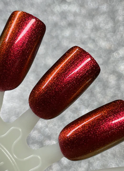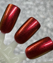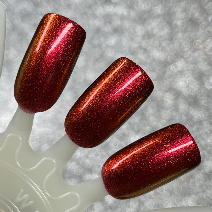 This polish has a red base and red, orange, and gold shifting multichrome.