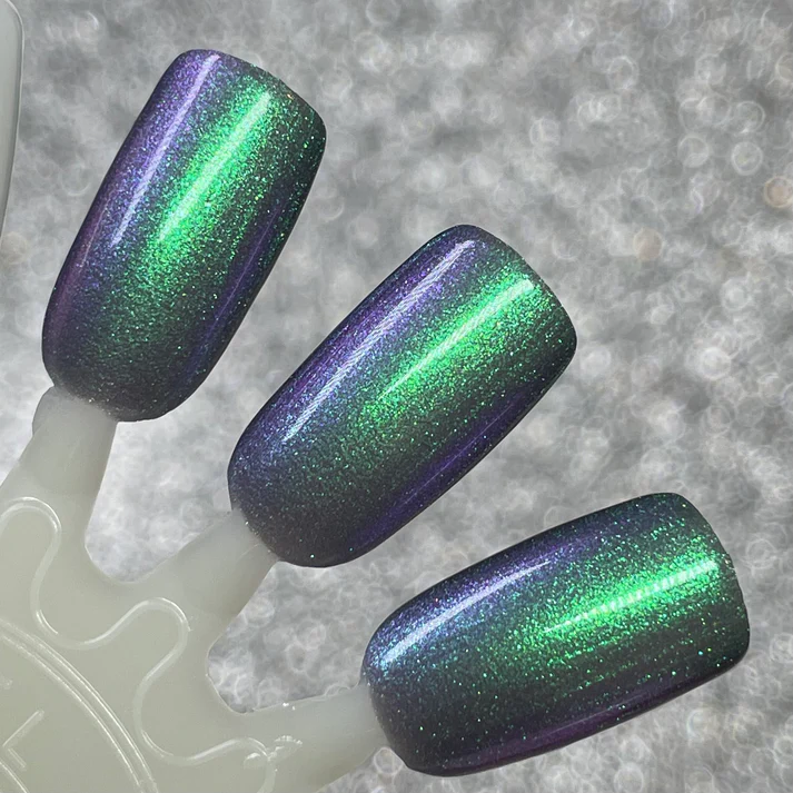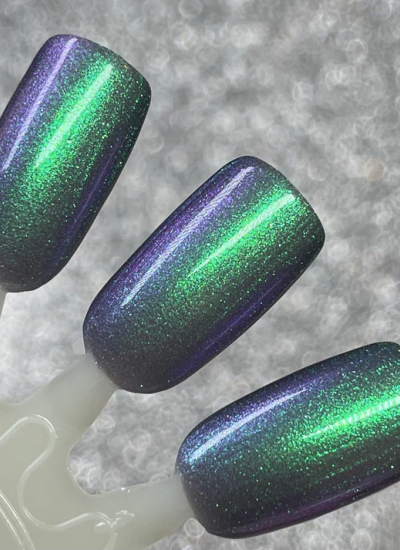 This polish has a purplish gray base with green, blue, purple shifting shimmer.