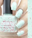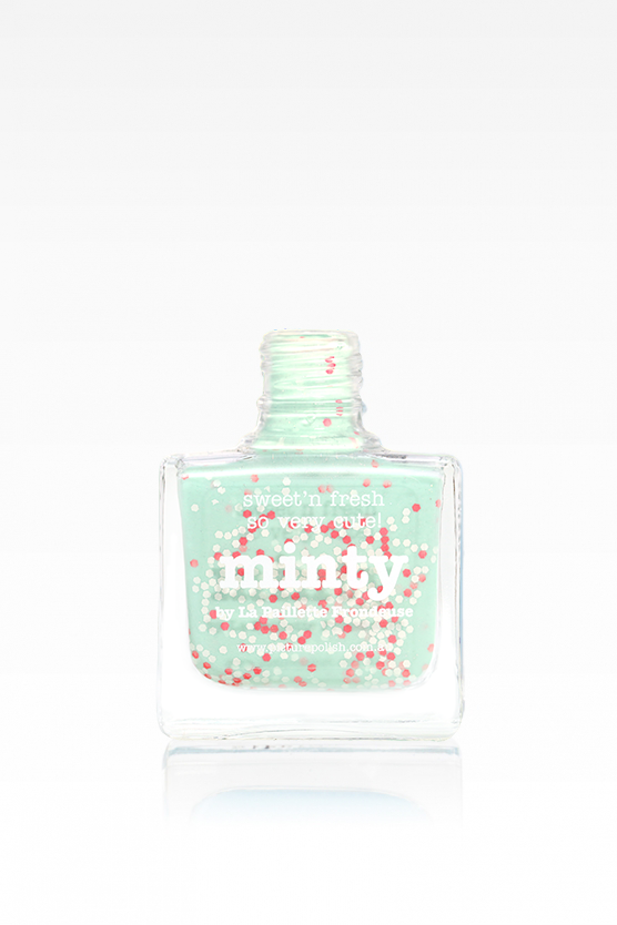 Formulation: 5 Free - Minty is a pastel blue/green jelly with mutli-sized hex glitter in coral and white with scatter holo and dries slightly textured on the nail. Apply Top on Gloss! to smooth out the textured feel.