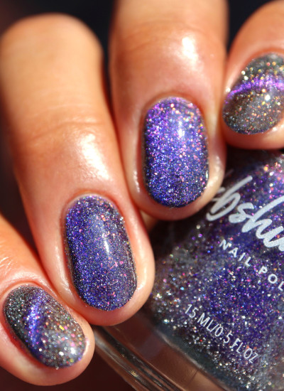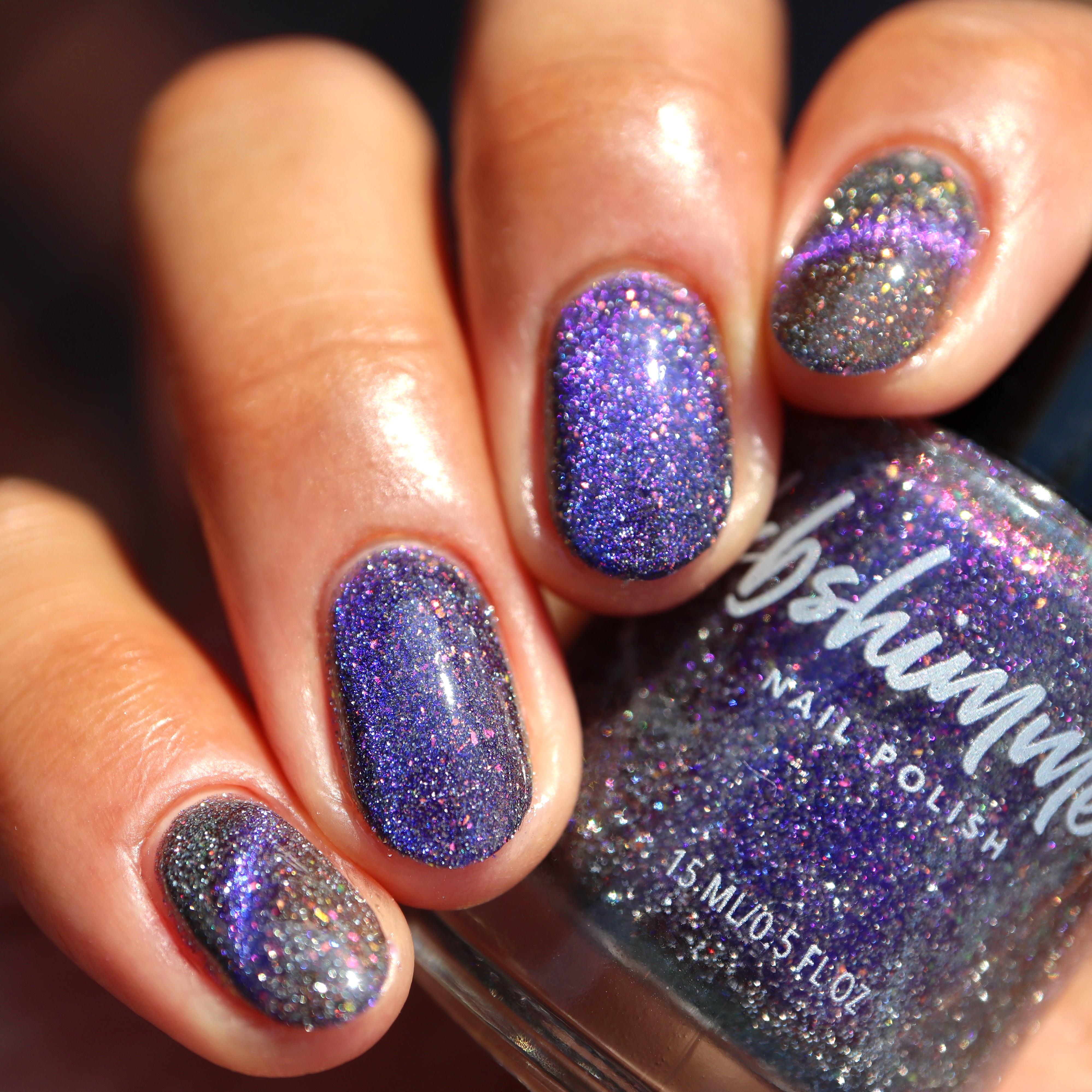 I’ll Bewitch You Shortly is an enchanting reflective, shifty nail polish made to twinkle and shine with magnetic properties. When worn without a magnet, an indigo-to-blue-to-midnight shift sets off magical pink sparks that shift into orange and gold. In brighter light or under flash, silver reflective glitter comes out to play, amping up the blue shade. When used with a magnet, the black background sets off the sparks and the purple-to-blue shift of the magnetic pigment. Wear without topcoat for a fun textured look (the maker’s favorite). For a glass-like finish, follow with a coat of Smooth Moves Glitter Topper and a coat of Clearly On Top quick-dry topcoat. This shade looks magical both with and without using a magnet, so try wearing it both ways!