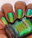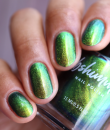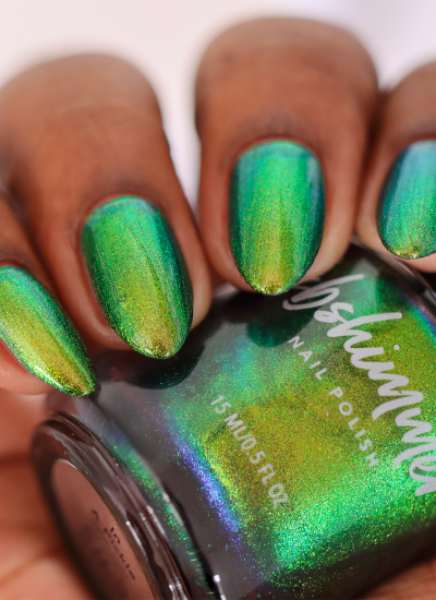 In A Pickle is a vibrant green, multifaceted chrome nail polish that easily catches the eye as it shifts between colors. This multichrome shade features a warm golden hue that accents the green, catching hints of orange, deep blue, and near-navy hues. Best in 2 coats, follow with a quick-dry topcoat like Clearly On Top for best results.