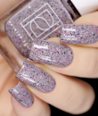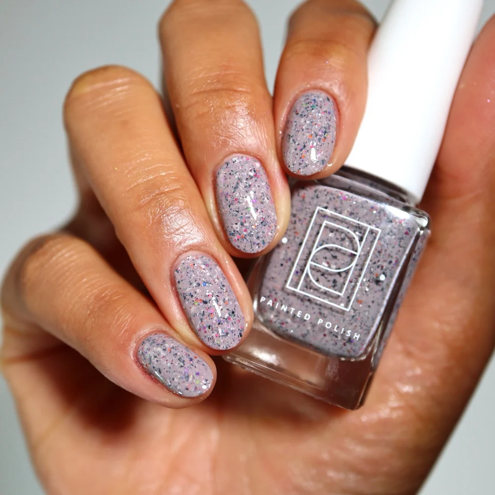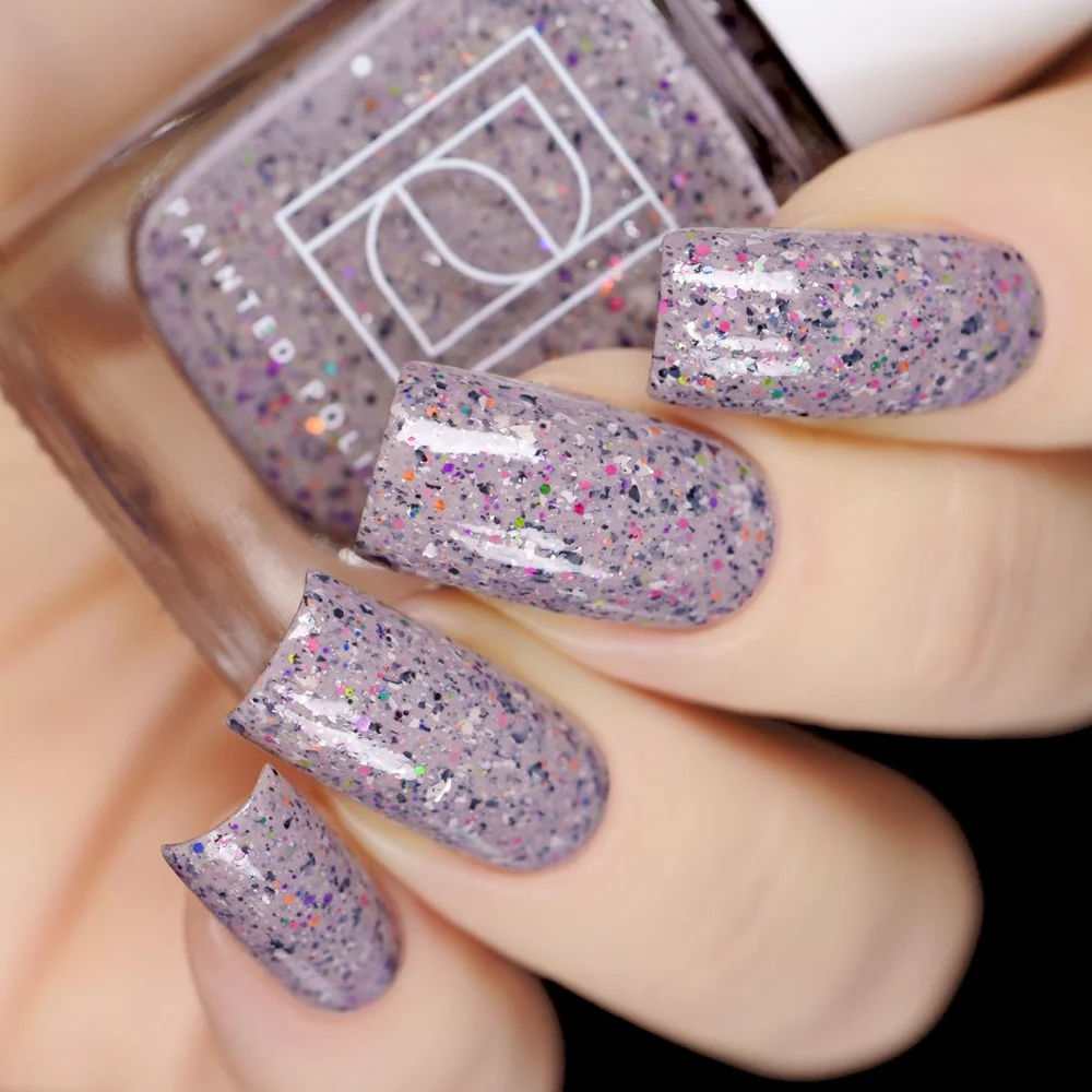 This shade features black and silver metallic flakies as well as a rainbow of candy-colored glitters in a Dove grey crelly base!